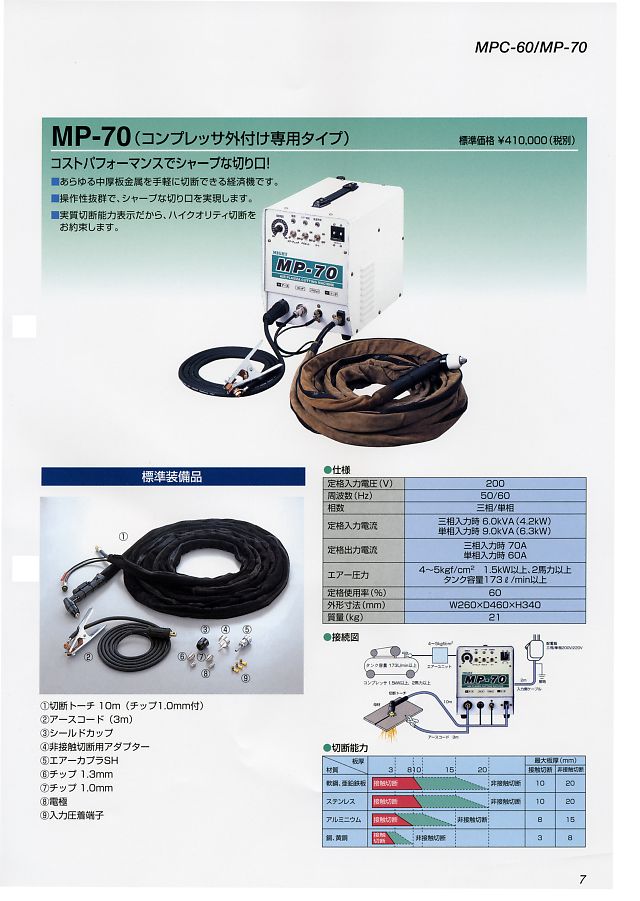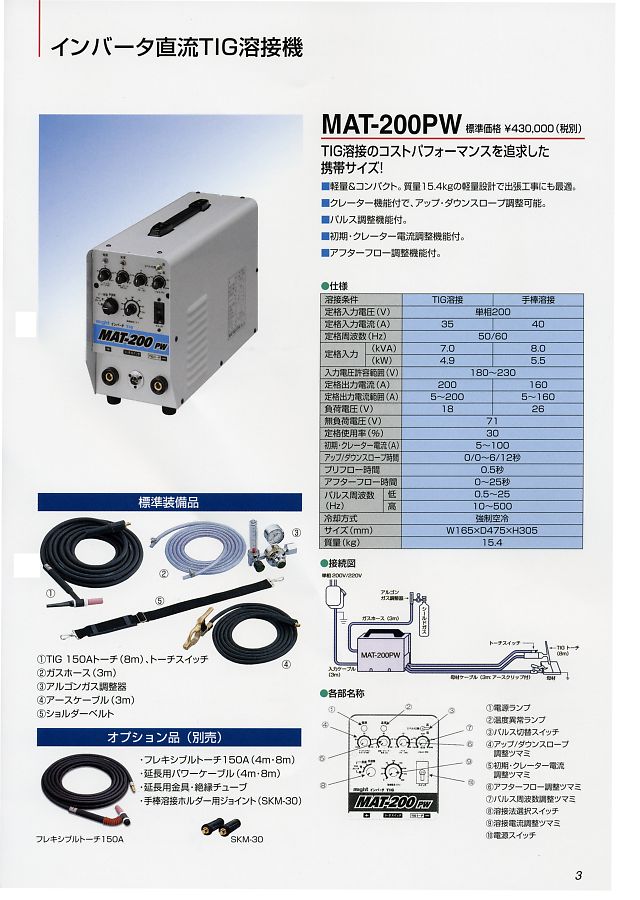 マイト工業のハイパワーインバータ直流TIG溶接機MHT?150は、超小型、ハイパワーで出張工事に最適!直流TIG・パルスTIG溶接/手棒溶接兼用機です。インバータ直流TIG溶接機MAT?200PWはTIG溶接のコストパフォーマンスを追及した形態サイズ。軽量コンパクト。質量15.4kgの軽量設計で出張工事にも最適。クレーター機能付で、アップ・ダウンスロープ調整可能。パルス調整機能付。初期・クレーター電流調整機能付。アフターフロー調整機能付。フルデジタルTIG溶接機MT?201APWは直流に加えて、アルミニウム、マグネシウムの溶接が可能。プラズマ切断機MPS?60はコンプレッサ内蔵、外付け兼用タイプで、現場作業に最適。MPS?70はコンプレッサー外付けタイプです。