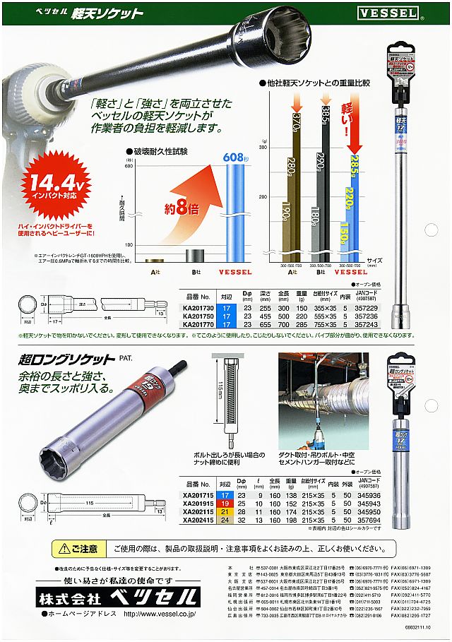 ベッセル軽天ソケット17mm。驚きの軽さで負担軽減!しかも軸圧入で折れに強い!頭の上まで何度も工具を上げ下げする軽天作業。作業者の負担を減らし、作業効率をアップする最大の鍵は「軽さ」です。ベッセル「軽天ソケット」はNo.1の「軽さ」に加えて、軸圧入により「強さ」もNo.1です。300mm、500mm、700mmの3種類。
