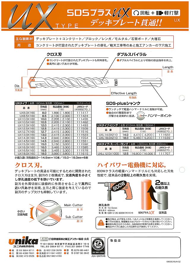 ユニカSDSプラスUX。デッキプレート+コンクリート穿孔!Xクロス刃、ダブルスパイラル。デッキプレートを貫通。刃先にクロス刃を採用したことにより、デッキプレートの貫通はもちろん真円に近い穴あけができアンカー挿入がスムーズ。対鉄筋性能、耐久性アップ。クロス刃は鉄筋に当たっても噛み込みが少なく、刃先と外径の磨耗が少ないため、安定した穿孔能力を維持します。オールアンカー施行に威力を発揮。コンクリートが打設されたデッキプレートも同時に穿孔できるので、軽天工事等のアンカー下穴施行が簡略化され、後施工アンカーの施工で従来の作業工程が大幅に削減されます。