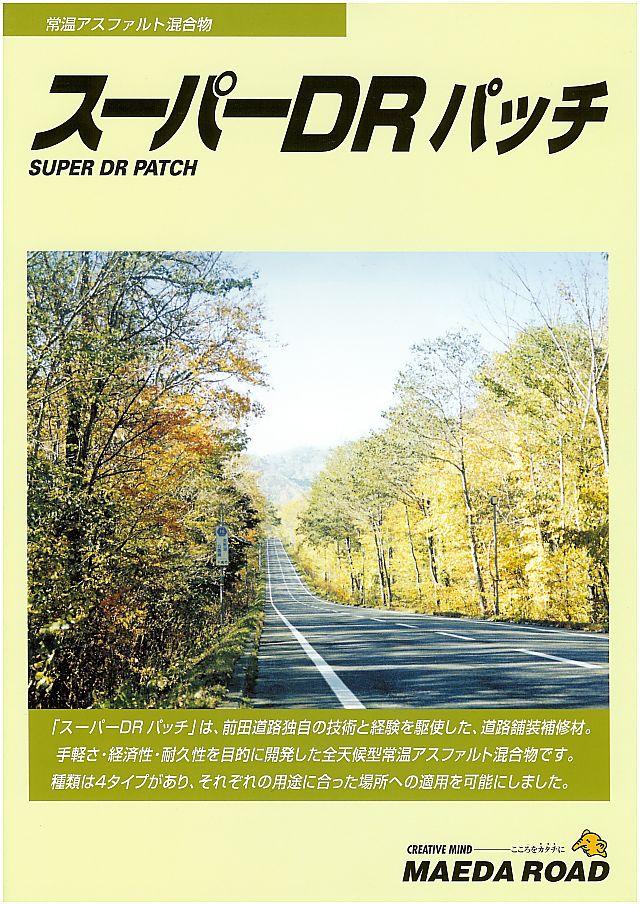 前田道路 道路補修材 スーパーDRパッチ 前田道路独自の技術と英検を駆使した、道路舗装補修材。手軽さ、経済性、耐久性を目的に開発した全天候型常温アスファルト混合物です。種類は4タイプ有り、それぞれの用途にあった場所への適用を可能にしました。スーパーDRクリア、スーパーDRスリット、スーパートップ13