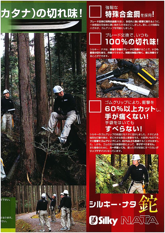 シルキー ナタ 鉈 NATA 目指したのは刀(カタナ)の切れ味。強靱な合金ハガネ一体構造。滑らず、外さず、衝撃カット。ゴムグリップ。ブレード交換が出来るナタ。150ミリ、180ミリ、210ミリ、240ミリに片刃、両刃があります。