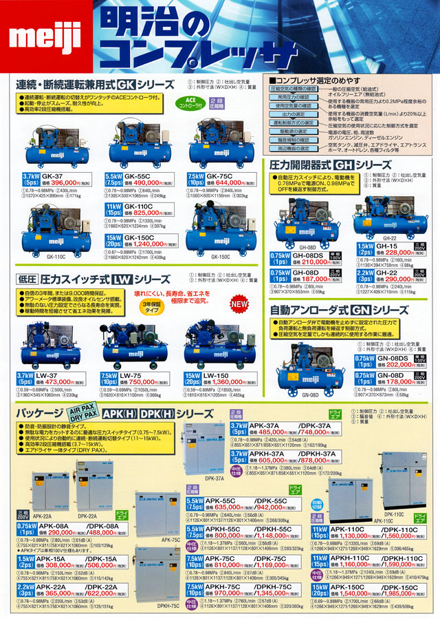 明治製作所 エアーコンプレッサ 連続・断続運転兼用式、圧力スイッチ式、圧力開閉器式、自動アンローダ式、パッケージタイプ、オイルフリータイプ、スクリュータイプ、スクロールタイプ、中圧二段式、エンジン駆動、ハンディタイプ、ブースタコンプレッサ、空気タンク、ドレンクリーン、冷凍式エアドライヤー、空気浄化機器、空気圧補器