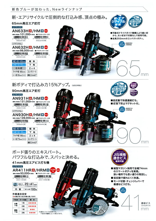 マキタ 高圧エア釘打機、高圧エアビス打機 AN633H AN632H AN931H AN930H AR411HR 全身すべてがハイパフォーマンス!新・エアリサイクル機構により、特長すべてが最高水準5つ星!他の追随を許さない、優れたトータルバランスを実現。新・エアリサイクル機構 搭載 排気エアを効率よく、無駄なく再利用。 各部エア流路の見直しにより、効率よくエアが流れます。 また新ヘッドバルブの採用により、軽量かつ耐久性&メンテナンス性が向上しました。パワフル 効率よくエアを活用するため、少ないエア消費量でも、より深くパワフルに打込めます。釘の打込み深さ約30%向上 (当社従来機比)低反動 コンタクトアームのストローク量を増加させ低反動を実現。通常は多くなるエア消費量をエアリサイクルで低減させています。低騒音 新・エアリサイクル機構により、排出されるエア量を削減。さらに排気口のフィルタ面積を大型化し、低騒音を実現しました。大型排気口(ボディ左右 側面取付)フィルタの大型化とあわせ、耳に優しい排気音に改善。「可動式ドライバガイド」搭載1、ドライバガイドはそのままで細い釘でも倒さずに打込み。2、軸周りのダンパが、衝撃を吸収。現場掃除に便利な エアダスタ付 本体内部を通らず、クリーンなエアを直接噴射できます。(AN633Hのみ)新デザイン 小型ボディ 全高が低くなり、取り回しが快適です。1. 斜め打ち性能向上 2. 握りやすいグリップ形状 3. 「簡単釘装てん」ピーチマガジン 4. 打込み深さ調整アジャスタ 5. 単発・連続打ち自動切替