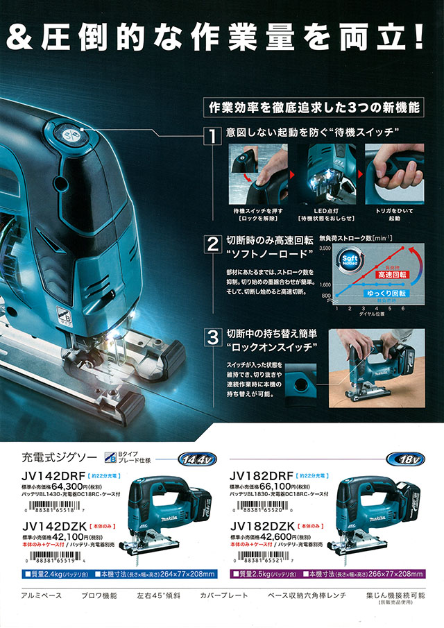 マキタ 充電式ジグソー JV142DRF/JV182DRF ブラシレスモータ搭載によりAC機と同等の切断スピード&圧倒的な作業量を両立! Bタイプ ブレード仕様 LEDライト付 無段変速 集じん機に接続できます。 オービタル機構 プラスチックケース付 ハイパワーブラシレスモータ搭載 「電子部品の高性能化」「回路設計技術向上」に より性能アップ 作業効率を徹底追求した3つの新機能 低振動&低騒音で快適 バランスプレートがロッドと逆方向に動く事で振動を低減させました。 防じん性向上 ロッド軸受部のダストシールを改良し、 ブロワ機能を利用する事で防じん性能が向上しました。 工具レスブレード交換 ① ツールオープナーを開くだけで簡単にブレード取外し。 ② 取り付けはブレードを差込むだけ。 オービタル3段+ストレート 高輝度LEDライト(2灯) スピード調整ダイヤル(1?6) 握りやすいソフトグリップ その他特徴 ・アルミベース ・ブロワ機能 ・左右45°傾斜 ・カバープレート ・ベース収納六角棒レンチ ・集じん機接続可能 (別販売品使用)