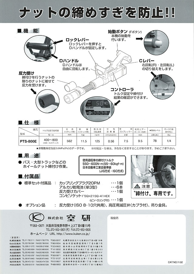 空研 パワートルクセッター PTS-800E 高精度な締め付けトルク管理ができる、電子制御コントローラー内蔵!特長:低振動・低騒音!電子制御コントローラー内蔵により高精度な締め付けトルク管理可能。電源の自動起動とオートパワーオフ機能搭載。ソフトな二段式始動ボタンで作業安全。電子制御回路用バッテリー内蔵により、電源供給配線不要。ナットが着座するまでは高速回転し作業性が良い。