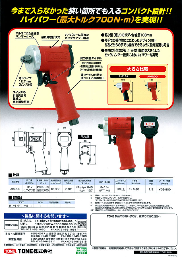 TONE㈱ エアーインパクトレンチ(ショートタイプ) AI4200 超小型(短い)ボディ(全長108ミリ)でハイパワー(最大トルク700N・m)を実現!!