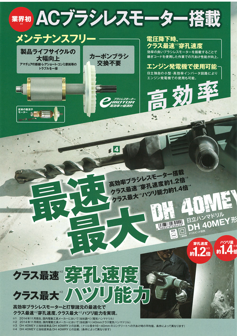 日立工機 ハンマドリル WH40MEY ハンマドリル:DH40MEY二重絶縁業界初・ACブラシレスモーター搭載 ACブラシレスモーター搭載低振動システム搭載アルミニウム二重絶縁ドリルビット:最大40mm 希望小売価格(消費税別) □ 93,800 ドリルビット別売 過酷な環境によるアマチュアの断線・レアショート・コンミ摩耗等のトラブルを一掃することで、製品ライフサイクルの大幅向上を実現しました。また、カーボンブラシの交換も不要です。 電圧降下時においても、クラス最速※穿孔速度 効率の良いブラシレスモーターを搭載することで継ぎコードを使用した作業での穴あけ性能が向上。エンジン発電機で使用可能 日立独自の小形・高効率インバータ回路によりエンジン発電機での使用も可能。 クラス最速の穿孔速度・クラス最大のハツリ能力 クラス最速※1 の穿孔速度・クラス最大※1 のハツリ能力 振動低減・作業性アップ 低振動システム搭載 日立独自のコイルスプリング式動吸振器特許出願中 コイルスプリングとウェイトで構成された動吸振器を本体と共振させることにより振動を吸収する日立独自のコイルスプリング式動吸振器を採用。振動が低減し、作業性が向上。 コイルスプリング式動吸振器防振ハンドル特許 トランザトリユニット方式防振構造とナイトハルトバネ式防振構造を採用し、こじりによる操作性を損なうことなく防振効果が得られます。 高耐久 アルミダイカストボディとプラスチック内筒式二重絶縁構造の採用 アルミ二重絶縁構造 強度(高剛性)に優れたアルミダイカストボディと、モーター部をプラスチック製の筒に収めた二重構造によりハウジングの剛性が向上。モーター部の耐久性が大幅にアップしました。操作性向上 プッシュボタン式定速度・変速制御 作業内容に合わせて打撃数を調整できる電子制御回路を内蔵。プッシュボタン式の変速スイッチで4段階に打撃数を調整できます。